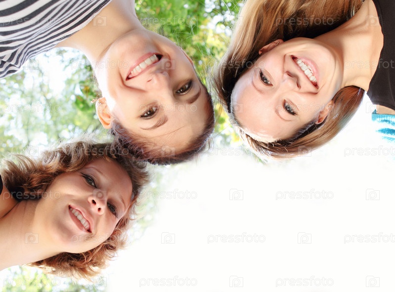 Юные счастливые друзья улыбаются в парке