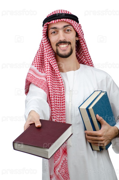 Портрет молодого мужчины-араба с книгами в руках на белом фоне