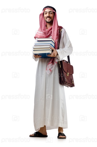 Портрет молодого мужчины-араба с книгами в руках на белом фоне