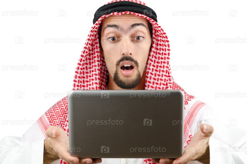 Портрет молодого удивленного мужчины-араба с ноутбуком на белом фоне