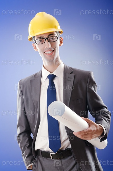 Молодой инженер с чертежами на голубом фоне