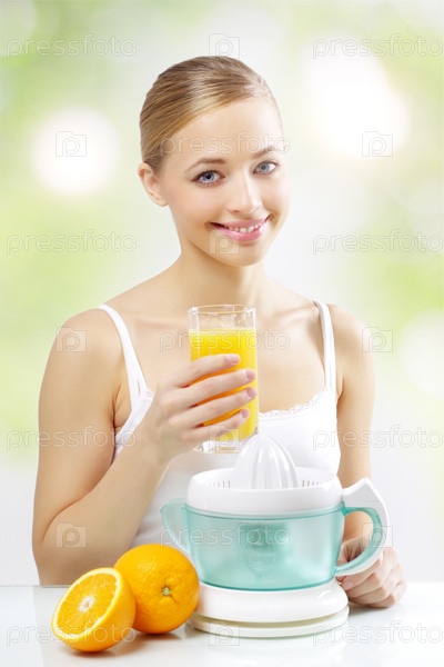 Девушка с соковыжималкой и стаканом сока на светлом фоне
