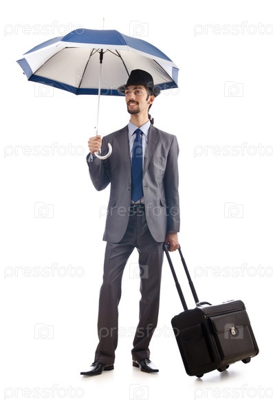 Молодой бизнесмен с чемоданом и зонтом на белом фоне