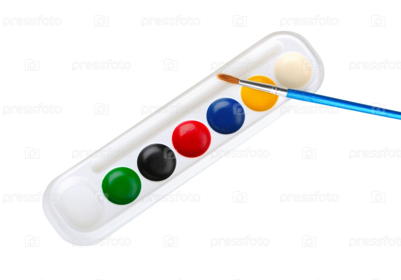 Акварель и кисточка на белом фоне