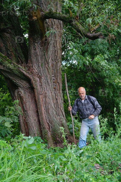 Пожилой мужчина в походе по лесу