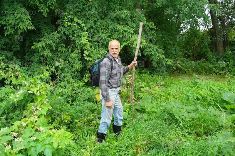 Пожилой мужчина в походе по лесу