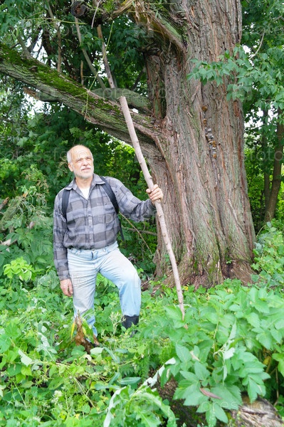 Пожилой мужчина в походе по лесу