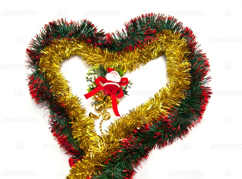 Сердце из мишуры и фигурка Санты с колокольчиками на белом фоне