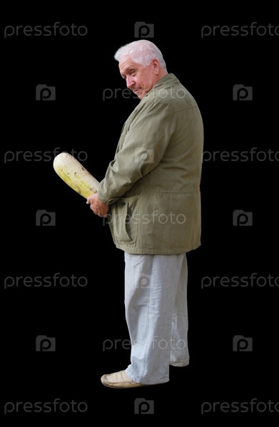 Мужчина с кабачком на черном фоне