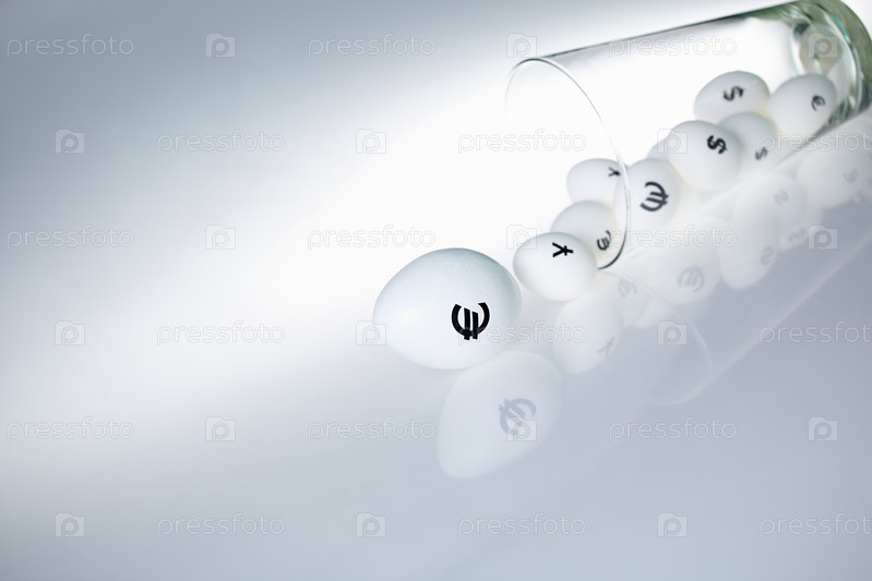 Яйца со знаками разных валют на сером фоне