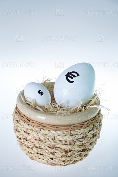 Яйца со знаками евро и доллара на сером фоне