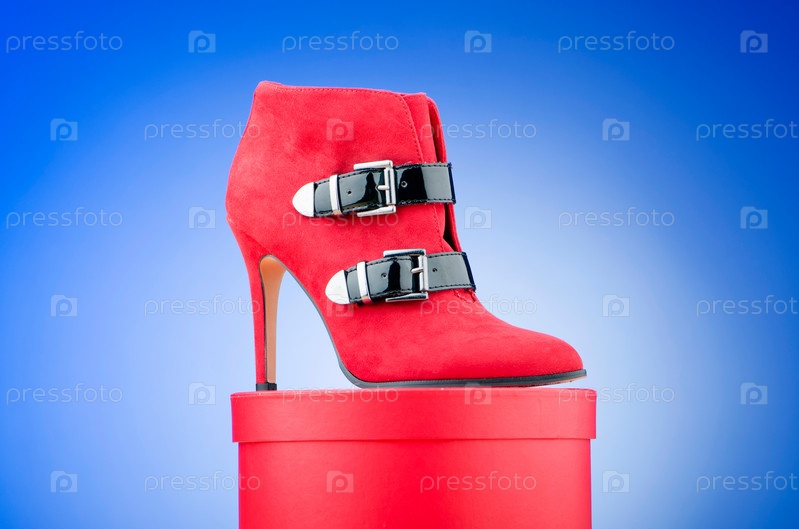 Женский ботильон и коробка на синем фоне