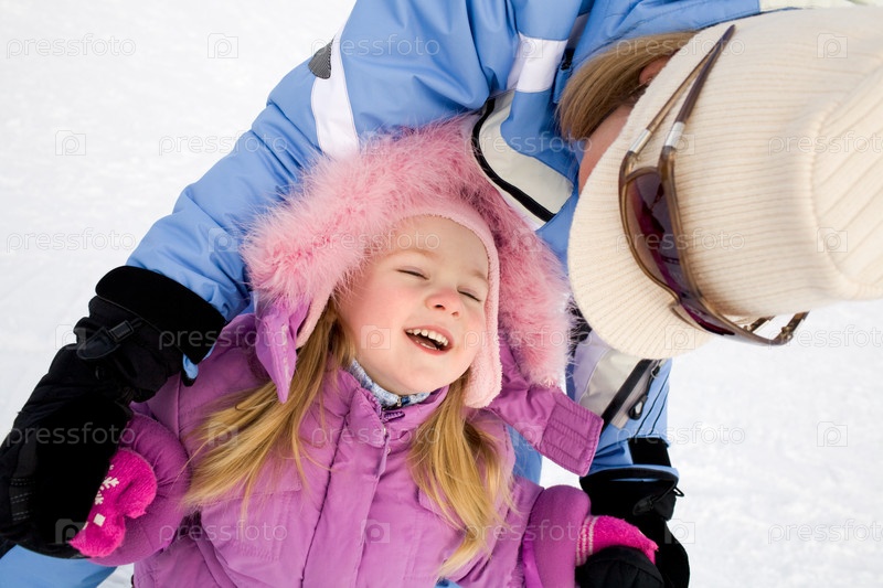 Вид сверху игривой девочки, весело развлекающейся во время катания на лыжах со своей матерью