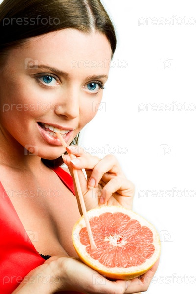 Фото красивой девушки, пьющей свежий натуральный сок из апельсина