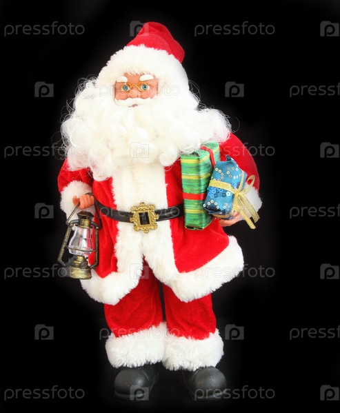 Игрушка Санта-Клаус с лампой и подарками на черном фоне