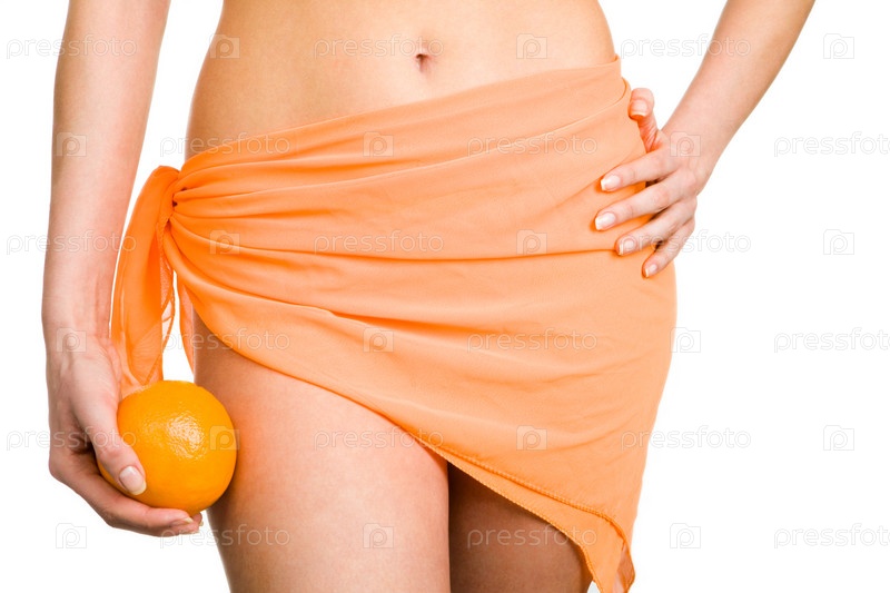 Часть женского туловища с ярким парео на бедрах и свежим апельсином в руке