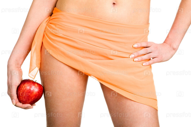 Изображение женской фигуры, одетой в оранжевое парео на бедрах и держащей зрелое яблоко в руке