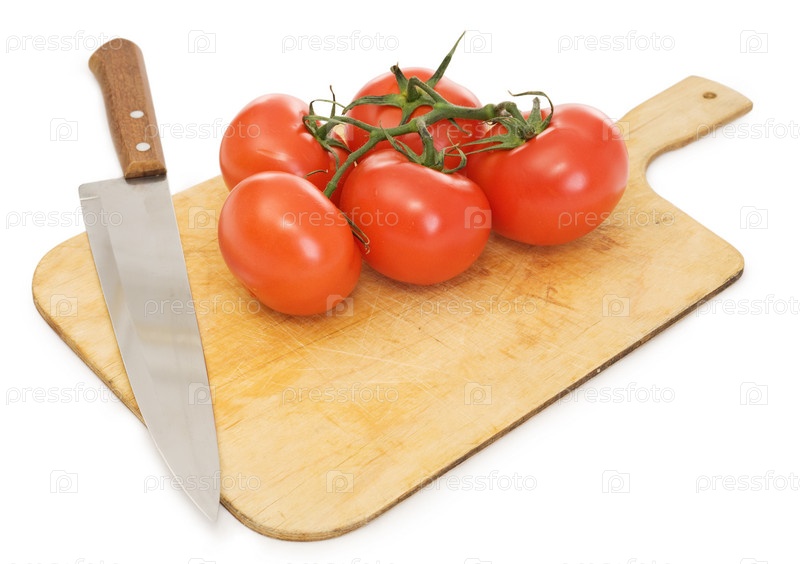 Зрелые красные помидоры и кухонный нож на режущей доске