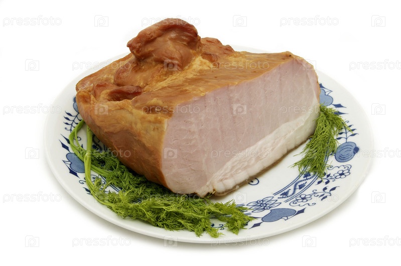 Копченое мясо с укропом на тарелке, изолированное на белом фоне