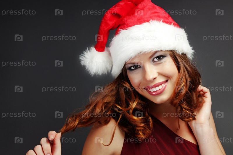 Девушка в новогоднем колпаке на сером фоне