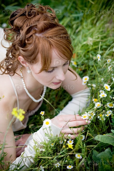 Невеста лежит на цветущей поляне