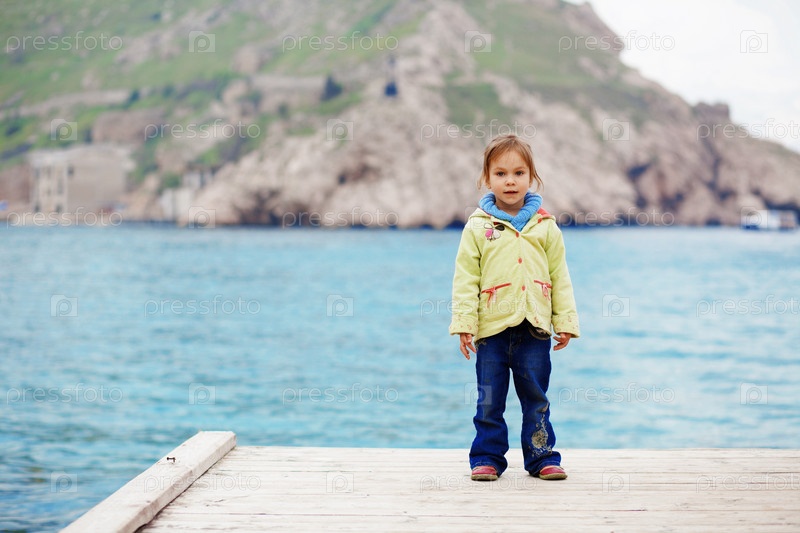 Маленькая девочка на причале у моря осенью