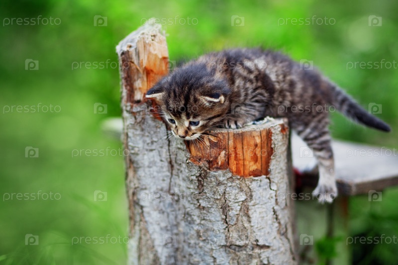 Маленький серый котенок на пеньке