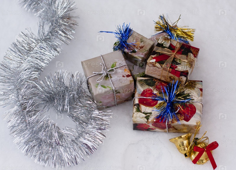 Подарочные коробки и мишура на белом снегу