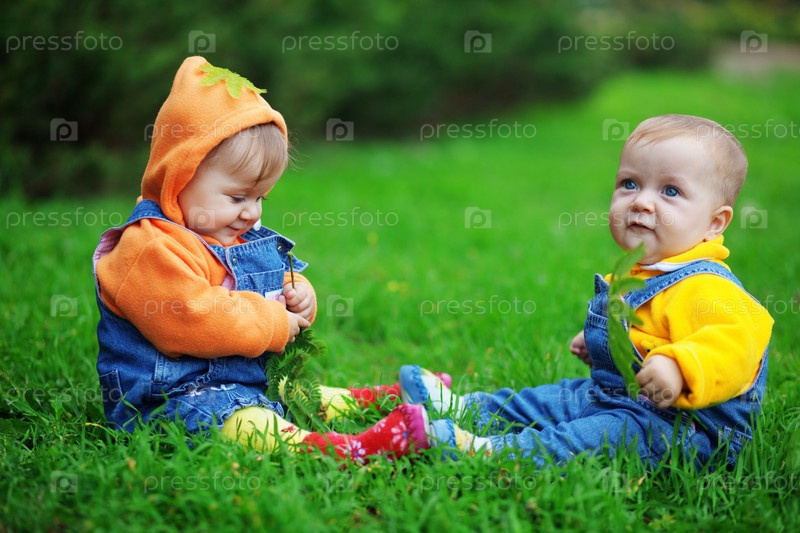 Симпатичные близнецы младенцы, сидя на свежей зеленой траве