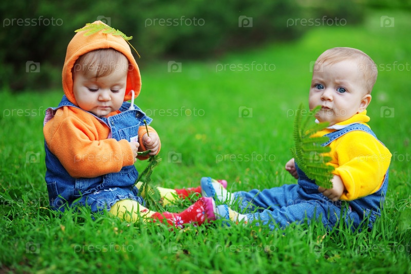 Симпатичные близнецы младенцы, сидя на свежей зеленой траве
