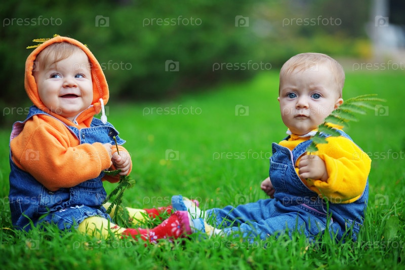 Симпатичные близнецы младенцы, сидя на свежей зеленой траве