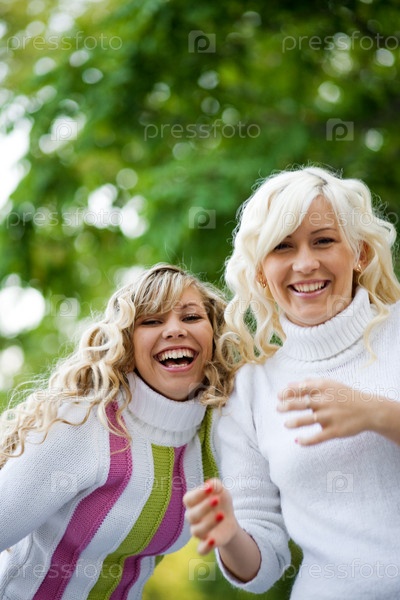 Две симпатичные веселые блондинки на открытом воздухе