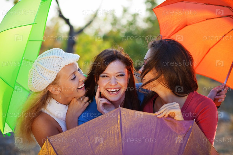 Три девушки с разноцветными зонтиками в осеннем парке
