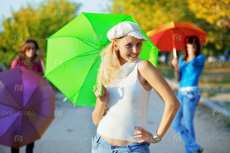 Три девушки с разноцветными зонтиками в осеннем парке