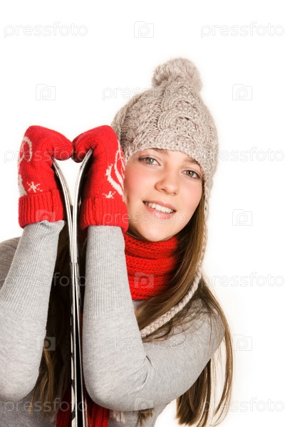 Изображение красивой лыжницы в тёплой одежде на белом фоне
