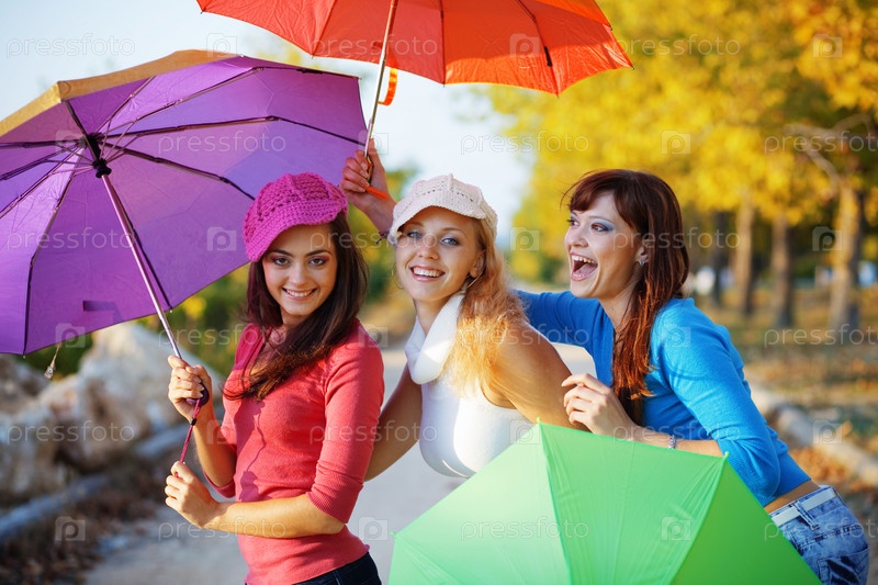 Три девушки с разноцветными зонтиками в осеннем парке