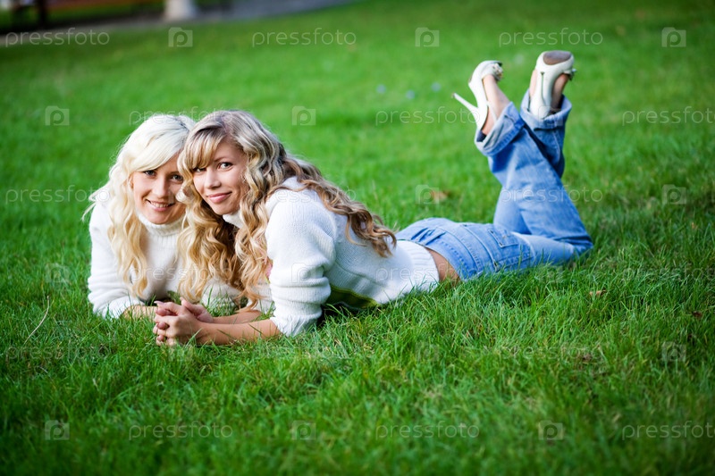Девушки лежат на зеленой траве на открытом воздухе
