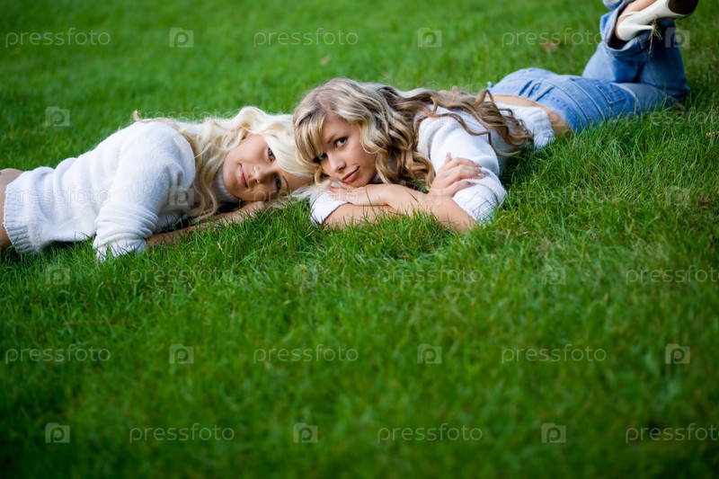Девушки лежат на зеленой траве на открытом воздухе