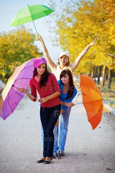 Три девушки с разноцветными зонтиками в осеннем парке