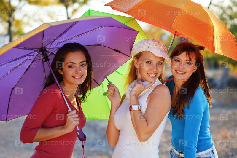 Три девушки с разноцветными зонтиками в осеннем парке