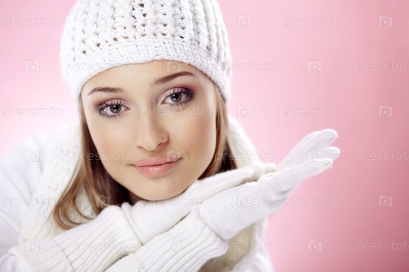 Девушка в зимней одежде на розовом фоне