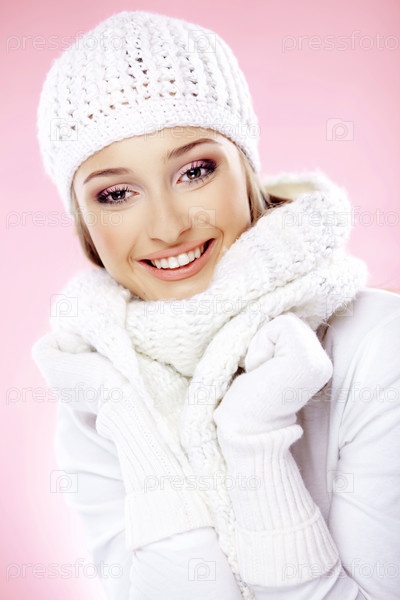 Девушка в зимней одежде на розовом фоне