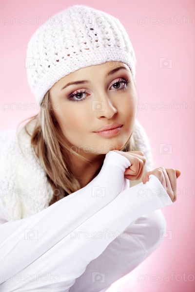 Девушка в зимней одежде на розовом фоне