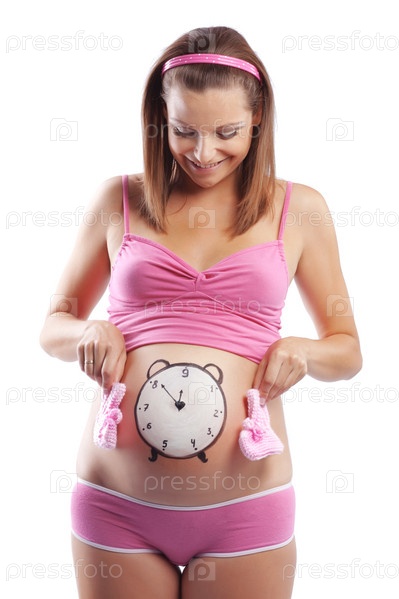 Счастливая беременная женщина с изображением часов на животе и с носочками для ребенка в руках