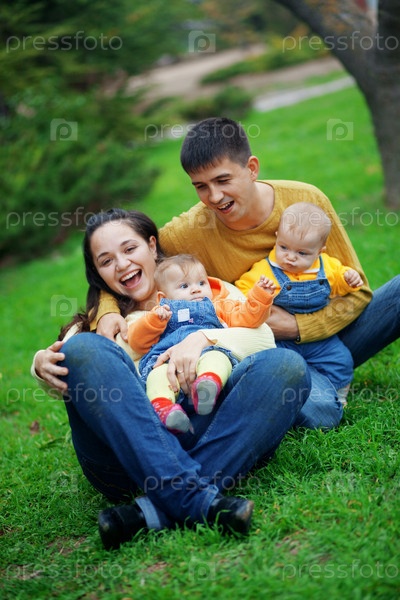 Молодые родители с детьми в парке