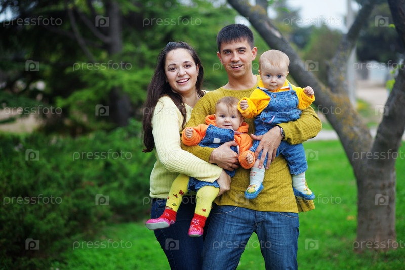Молодые родители с детьми в парке