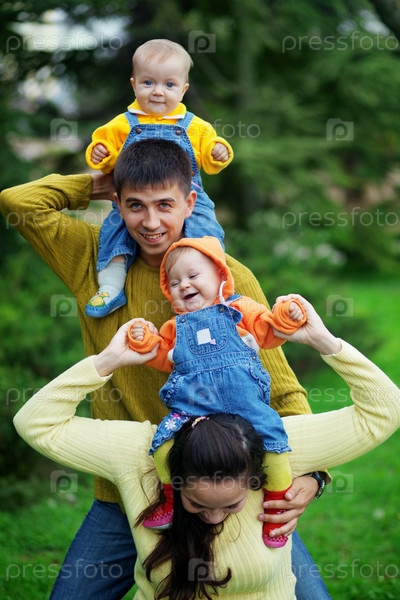 Молодые родители с детьми в парке