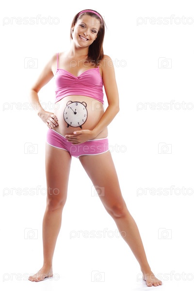 Счастливая беременная женщина с изображением часов на животе