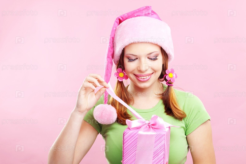 Молодая красивая женщина в новогодней шапке с подарком