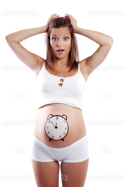 Озадаченная беременная женщина с изображением часов на животе